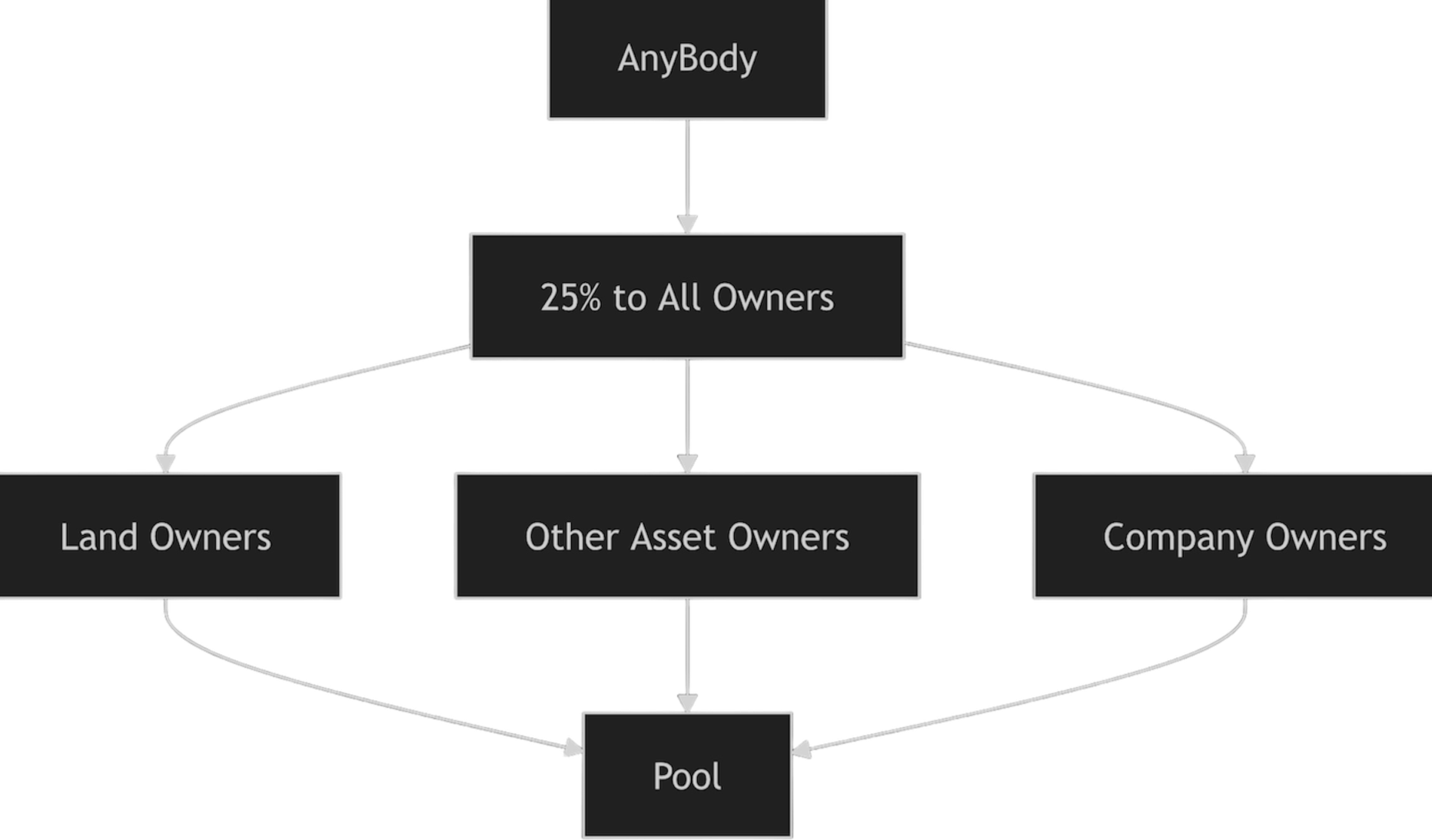 25% of all profits generated across all projects combined will be distributed annually, forever, to all asset owners in the pool. This will be proportional to the initial value of their assets when it was contributed to the pool.